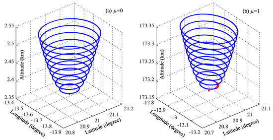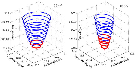 Figure 10 gives the results of target positions of Event 11, with four sub-plots for C/A code ambiguity 0, 1, 2 and 3. The blue dots are the results considering only the delay, and the red dots considering both the delay and Doppler frequency. The dots show a “top” pattern in all sub-plots, which confirms the analyses of Figure 9. It can be seen that in sub-plot (a) where the “target” is near the Earth’s surface (), there are no red dots, which means there are no solutions under the geometry assumption of Figure 9 and the assumption that the “target” is static. This is understandable because the Doppler frequency difference between the bright point and specular point of Event 11 is 3000 Hz according to Table 2, which is large because the Doppler frequency of a scattering point of which path delay is less than 300 m is usually less than 1500 Hz as compared to that of a specular point on the Earth’s surface. When , there are an increasing number of red dots as shown in sub-plots (b) to (d). The results for target positions of other events are similar to Figure 10, which are not presented here.