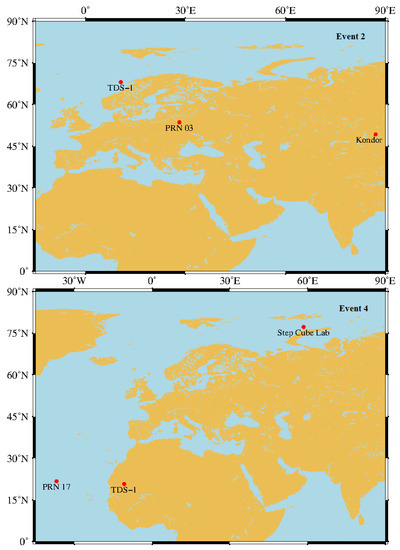 In addition, the sub-satellite positions of the transmitter, receiver and valid target candidates of the three events are shown in Figure 11. The upper, middle and lower sub-figures are for the Event 2, 4 and 5 respectively. In normal reflection of GNSS-R, such as the dashed line through S in Figure 8, the sub-satellite positions of transmitter, receiver and reflection point (S) are on a line. It can be seen from Figure 11 that the sub-satellite point of the target candidate is far away from the line formed by those of the transmitter and receiver for the three events. This means the reflection conditions of the three events are like the one shown by the blue lines of Figure 8.