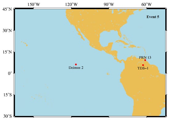 The threshold value of is set to 10 km considering the SGP4 orbit error, TLE age, and other error sources including path delay error caused by the DDMs, and orbit errors of the transmitter and receiver. The threshold value of is set to around 1000 Hz considering the DDM Doppler resolution is 500 Hz. Three events have valid candidates after applying the criteria that km, Hz, and the geometry condition. The relevant information of the three events is listed in Table 3, including , , and the altitude of the target candidate. It can be seen from Table 3 that the valid candidates for Events 2, 4 and 5 are Kondor, Step Cube Lab and Deimos 2, respectively. The values of for Kondor, Step Cube Lab and Deimos 2 are around 500 m which is small. This is understandable because (1) the reflected path length is usually insensitive to the position of scattering point because the semi-major and semi-minor of an iso-delay curve is from several kilometres to tens of kilometres in space-based scenario [40], (2) the path delay extracted from the DDMs is of the order of tens of metres, which is related to the delay resolution (244 ns), and (3) the errors induced by other factors such as the orbit of the transmitter and receiver are much smaller, and considered to be negligible. In addition, the of the three candidates are 607 Hz, 568 Hz and 1046 Hz respectively, which are also reasonable considering the Doppler resolution of 500 Hz for the TDS-1 DDMs. Therefore, Kondor, Step Cube Lab and Deimos 2 can be said to meet the delay and Doppler frequency conditions, so they are possibly targets of the bright points for Events 2, 4 and 5, respectively.