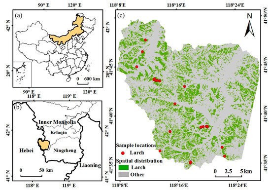 | Larch classification image | The larch classification result was developed from ZY-3 data using support vector machine (SVM)—user’s and producer’s accuracy of 79.7% and 94.8%. | Details were provided by Xie et al. [38]. |