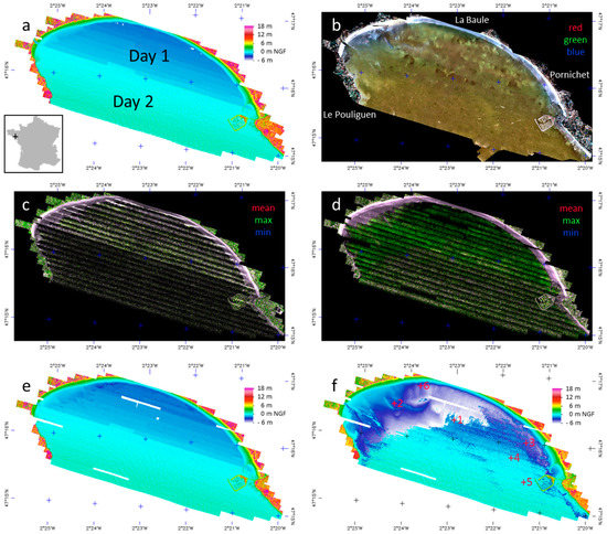 The ray tracing FWF image of La Baule bay mosaic (Figure 7a) has 20 strips made of 53 segments. A quick view of the ray tracing FWF image can be made with three channels at the elevation −1 m, −4 m and −7 m NGF respectively in red, green and blue of the composite image in Figure 7a. The mean, max and min color composite image, Figure 7b, similar to Figure 1c,d, displays different false colors. This difference is from numerous baseline drops modifying the distribution of the minimum values, highlighted in blue, all pixels free of intensity drops.