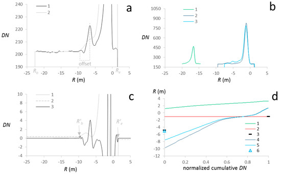 Its first derivative {−1, 0, +1} is then used to determine a shorter segment of meaningful signal right above the baseline estimation. In practice a forward scan of the first derivative of the 3-m FWHM Gaussian filtered FWF, to the first value above the DNb threshold chosen by the operator, gives the beginning R’b and a backward scan up to the first value below the same but negative threshold DNe gives the end R’e of the shorter meaningful FWF (Figure 2c).