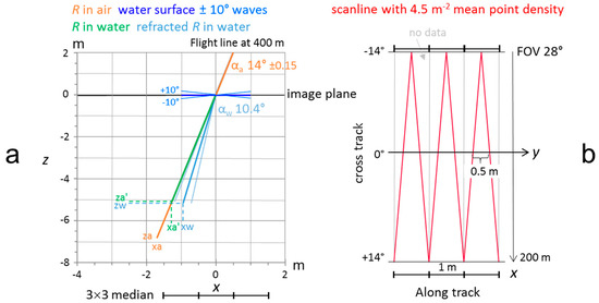 Cube image focalized on a plane at elevation 0 m visualized on (x, z) section with a record of the incident angle α: (a) Example of light path rotation with sea waves undulating from −10° to 10° on a maximum incident angle of laser pulse at 14° showing that all apparent ranges of −7 m fall into a single 1 m (x, y) pixel and 0.15 m (z) elevation in air and at −5 m in water with a 1.34 water index correction; thick line caption: apparent range (R) in air is orange, shortened R in water is green and light blue with refraction, water surface is blue; thin light blue lines are refracted LiDAR ranges due to −10° to 10° water surface undulations; (b) (x, y) plane of the scanline geometry giving a row spacing along track of 0.5 m at nadir to 1 m on side strip image with a minimum point density of 1 m−1 along track. Because of the 3 × 3 pixel median used for noise reduction, shows a three-pixel segment (a) and three rows in map (b), the effective resolution is 3 m × 3 m in both row and line directions.
