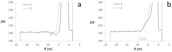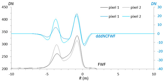 Profiles of FWF and dddNCFWF relative intensities (DN) of two pixels sampled in Figure 10 with only 1 low-pass application allowing the visualization of water layering instead of two low-passes used to minimize them.