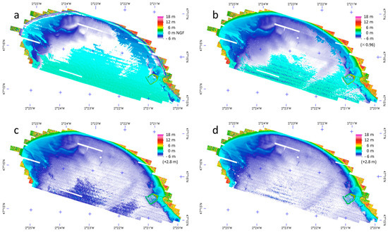 A 1 m × 1 m per pixel Digital Surface Model (DSM) of the first 1064 nm returns envelope was generated for a quick overview showing tide variation between swath and days (Figure 1a, see also high resolution figures in Supplementary Materials). Along with the Titan system and a JAI Integrated 5MP camera, GEOFIT Expert Company, 1 route de Gachet - CS 90711 – 44307 Nantes France, also provided a 1 m × 1 m pixel orthophoto of the area showing a characteristic brown colored water with turbidity variations. The 532-nm beam penetrating the water light path and speed are modified at the air–water interface, which is corrected by LMS [23] in final 532-nm echo files, not in FWF. Figure 1c,d present the minimum, maximum and mean of pixel size discrete intensities of 1064 nm and 532 nm returns respectively, water index correction is included for 532 nm data. All diffusing materials, vegetation thickness of 1064 nm data in Figure 1c and water column of 532 nm data in Figure 1d, appear with a false green color because of a larger scattering of their returns. By contrast, compact materials appear magenta. An incorrect setting explains the particularly strong hot spot effect along the nadir of the 1064 nm strip lines, Figure 1c, on all wet areas during the first airborne day. Wet sand with a tiny water film on the top produced the strongest returns saturating the LiDAR recording. Most bathymetric LiDAR on the market use a tilt of 6° between the 532 nm and 1064 nm beam to facilitate the penetration of the 532-nm laser beam in the water and its reflection on the top of the water with 1064 nm, but the absolute orientation of both laser beams with the ground, driven by the aircraft attitude, is also important, as experienced with the excessive 1064-nm hotspot of Figure 1c. Fortunately, this defect had no impact on the 532-nm data, Figure 1d. The DSM of the first 532 nm discrete echoes does not always catch the water surface in Figure 1e. This highlights the importance of water level detection with discrete 1064 nm echoes (Figure 1a). The DSM of the last 532 nm echoes used to give the bathymetric data, including water correction provided by LMS in Figure 1f, only accessed the most translucent part of the bay. This is mainly on its northern part, sheltered from the prevailing west to east wind parallel to the limit of bottom detection (Figure 1f). This is also correlated with a more visible perpendicular wave pattern on the second day of data acquisition, in the southern area where bottom detection is more difficult.