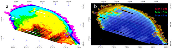 The multibeam data were reprocessed at FWF spatial resolution (1 m × 1 m) for a more rigorous comparison with dddNCFWF echoes. Both lines of acquisition are mosaicked in Figure 14a with color coding on a −5.5 m to −5 m range highlighting the presence of a narrow sandbank set (see arrow) while Figure 14b displays the same data in a range of −6 m to 6m facilitating the comparison with Figure 8. The first method based on dddNCFWF echo detection fails to map the bathymetry in the eastern part of Figure 14c because of higher turbidity and superficial wind effects.