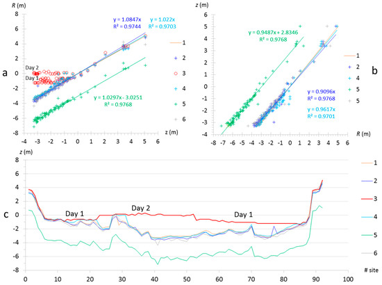Comparison between z elevation determined by ground GPS measurements and various LiDAR ranges, with water index correction when applicable, obtained along 92 sites: (a) plot of R results versus z; (b) plot of z versus R giving the correction coefficients; (c) display of all elevations (z) along the 92 site numbers with 2 and 9 weighted by 0.96. Common plot caption: (1) GPS derived z elevation, (2) discrete 532 nm last echoes provided by LMS, (3) discrete 1064 nm first echoes, (4) bottom of NCFWFT in water, (5) bottom of water NCFWFT in water plus 2.8 m offset, and (6) dddNCFWF last echoes with water index correction. The GPS-derived elevations z are plotted on R axis with 0° incident angle.