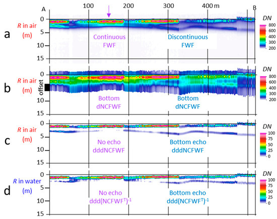 The FWF range slice along profile A-B of Figure 14 presented in Figure 15b clearly shows an increasing intensity near the bottom. The long recording of FWF down to −20 m (before water index correction) was important for the detection of the right baseline of each pixel. The sea bottom is well defined on the dddNCFWF range slice in Figure 15c but the missing part still justifies the use of the second method.