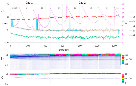 From the median applied on 3 × 3 pixel boxes, to remove bad returns in air, all the processes proposed in the present method work at a pixel scale without any consideration for the neighboring values and without any interpolation. This is particularly important to avoid laser pulse stretching on the slope. It is however possible to look at a large neighborhood in the final map of sea bottom to produce smoothed bathymetry. The following map, Figure 17, is an aggregation of 16 pixels smoothing and reducing its spatial resolution to 4 m wide pixels. A 0.5 m noise appears along the strip border on data from Day 2 whereas Day 1 data are free of noise in Figure 17. The first day is characterized by a low tide and flat sea surface (Figure 11 and Figure 16) whereas the second day displays stronger waves and a high tide as shown in the profile in Figure 15. This strip border noise mainly occurs for incident angles greater than 14° (Figure 7d) during high tide with well-formed sea waves. At low tide the conditions of observation were a lot greater with less noise and lower sea waves. A more careful adjustment of the airborne mission from day to day with tide conditions would save a lot of time in data processing. The better the data acquisition the faster and better the result. Early morning without thermal wind conditions is also recommended.