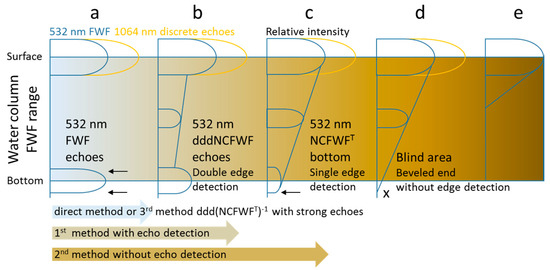 Figure 16 summarizes the FWF typology highlighted in this work. In Figure 16a, all methods are applicable in clear water with sharp double-edged echoes at sea bottom. In Figure 16b, the first method based on dddNCFWF allows the detection of weaker double-edged echoes but the second method based of NCFWFT must be used for the detection of single edged echoes at sea bottom, Figure 16c. The blind areas (Figure 16d,e) correspond to very long damping function where no edge marks the end of FWF signal. The inconsistency between FWF potential water thickness and the bathymetry reached by the bottom of NCFWFT was used to delineate such blind areas in Figure 9a and combined with binary its dilation to mask the full blind areas in Figure 17.