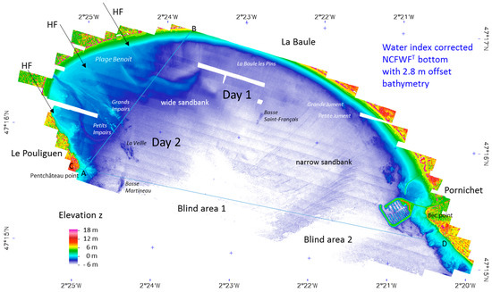 So, without a priori knowledge of the composition of the sea bottom and the sediment mobilized in the water column, we were able to detect the right bathymetry of the sea bottom as shown in Figure 11 with a calibration to GPS ground control points acquired at low tide (Figure 6) using: (1) 0.96 gain correction on dddNCFWF echoes with the first method and (2) 2.8 m offset on NCFWFT bottom with the second method of bathymetry mapping.