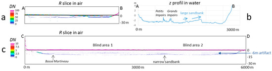 NCFWFT bottom bathymetry: (a) dddNCFWF range slice in air and (b) its corresponding last echoes with water index correction of the A-B profile (Figure 17) showing the wide sandbank asymmetry; (c) transversal profile C-D (Figure 17) of dddNCFWF range slice in air showing intermediate layers in the blind areas.