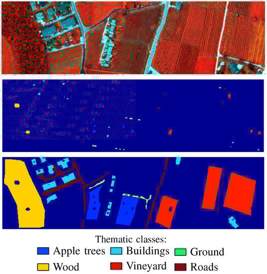 The first dataset is from a rural area in the south of the city of Trento, Italy. The size of the dataset is 600 by 166 pixels. The AISA Eagle sensor acquired the HSI with a spatial resolution of 1 m. The  hyperspectral data consist of 63 bands ranging from 0.40 to 0.99 m, where the spectral resolution is 9.2 nm. The available ground truth consists of six classes, i.e., Building, Wood, Apple Tree, Road, Vineyard, and Ground. Figure 1 illustrates a false color composite representation of the hyperspectral data along with the corresponding training and test samples. Table 2 provides information on the number of training and test samples for each class of interest.