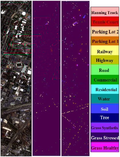 The Compact Airborne Spectrographic Imager (CASI) captured the second HSI over the University of Houston campus and the neighboring urban area. The data size is 349 × 1905 pixels, and the spatial resolution is 2.5 m. The hyperspectral dataset consists of 144 spectral bands ranging from 0.38 to 1.05 m. The 15 classes of interest are: Grass Healthy, Grass Stressed, Grass Synthetic, Tree, Soil, Water, Residential, Commercial, Road, Highway, Railway, Parking Lot 1, Parking Lot 2, Tennis Court and Running Track. “Parking Lot 1” includes parking garages at the ground level and also in elevated areas, while “Parking Lot 2” corresponds to parked vehicles. Figure 2 illustrates a false color composite representation of the hyperspectral data and the corresponding training and test samples. Table 3 provides information on the number of training and test samples.
