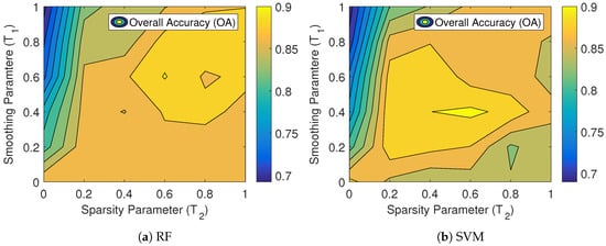 Figure 3 shows the contour plot of the OA with respect to  and  for both the random forest (RF) and the support vector machine (SVM) classifiers. It can be seen that along the  diagonal line the OA has little variability and takes on high values. The results confirm, for this example, that, if the tuning parameters are selected to be equal, SSLRA is less sensitive in terms of OA with respect to  and . Tuning  parameter selection is non-trivial and often a computationally-expensive task. To save computations, we selected . Here, we selected , which is the number of the classes, and we assumed that it is the dimension of the subspace. Note that one can claim that the number of classes of interests is the minimum of the dimension of the subspace.