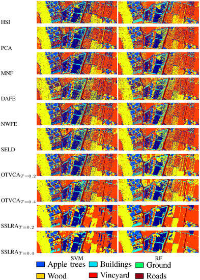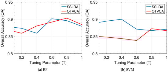 The tuning parameter T controls the amount of smoothness of , and therefore it can affect the classification accuracies. Hence, it is of interest to compare the performances of OTVCA and SSLRA with respect to T. Figure 4 shows that SSLRA and OTVCA give similar OA with respect to T for RF, but SSLRA give higher overall accuracies for SVM except when . Note that increasing T causes oversmoothing of the extracted feature, which might lead to the loss of information in the final classification map. We selected  and  to avoid oversmoothing of the  features.