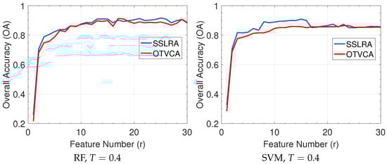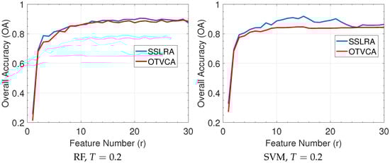 Figure 5 depicts the DR performance of SSLRA in terms of OA with respect to feature number r for both RF and SVM classifiers. For both SVM and RF and for both  and  when , SSLRA provides high OAs (close to 90%), which confirms the good performance of SSLRA concerning DR. Additionally, Figure 5 compares SSLRA with OTVCA in terms of OA with respect to r for both RF and SVM classifiers. The figure shows that SSLRA outperforms OTVCA in terms of OA and demonstrates better DR for the SVM classifier. For the RF, SSLRA and OTVCA perform similarly.