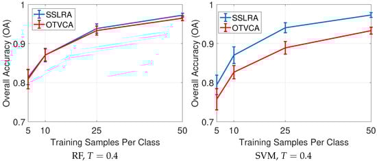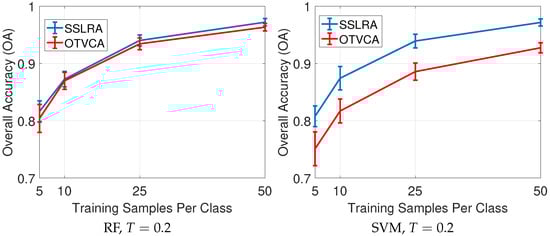 A major problem in classification applications is to collect reliable ground truth. The number of labeled samples per class is usually limited compared to the number of pixels. Hence, it is of interest to evaluate the performance of the proposed technique with respect to the number of samples selected per class. Figure 6 compares the performance of SSLRA with OTVCA in terms of OA obtained by applying SVM and RF on the extracted components. The experiments were performed by selecting different numbers of training samples per class (5, 10, 25, and 50) for the classification task. The reported results are the mean values over ten simulations each time using SVM and RF on the Houston features and selecting the training samples randomly (the error bars show standard deviations.). The results for both SSLRA and OTVCA are shown for  and .