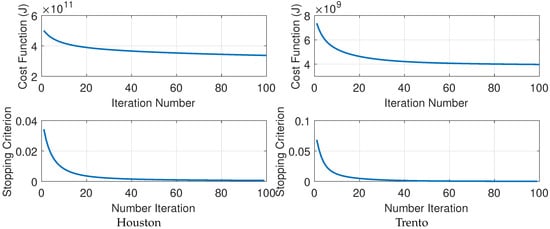 Figure 11 depicts the values of the cost function J and the values of the stopping criterion () when SSLRA was applied on the Houston and Trento datasets. It can be seen that the cost functions are strictly descending, as stated in Section 2, for both datasets. The stopping criterion values are less than 0.001 after 62 and 48 iterations for Houston and Trento, respectively. Therefore, in the experiments, we set the number of iterations to 100.