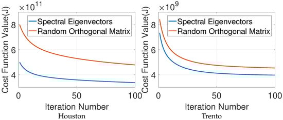 Figure 12 compares the values of the cost function (J) with respect to the number of iterations for two different initialization of SSLRA. It can be seen that random orthogonal matrix initialization gives higher cost function values for all iterations shown compared to the spectral eigenvectors initialization. Therefore, in this paper, spectral eigenvectors were used to initialize SSLRA, i.e., . Note that the proposed cost function is nonconvex and therefore different initializations might give different optimum values.
