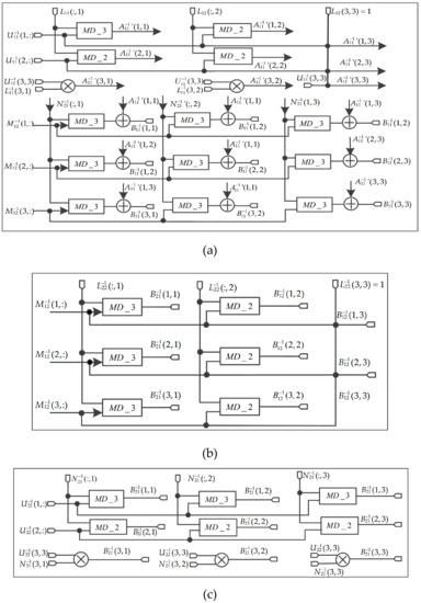 To implement and based on the FPGA, Equations (25) and (26) can be rewritten into Equations (30) and (31). In Equation (30), the elements of the matrix contain three formats, i.e., , , and . In Equation (31), the elements of the matrix contain three formats, i.e., , , and . The proposed parallel architecture for calculation of and is depicted in Figure 9. Twelve multipliers, fifteen MD modules, and three adders are used.
