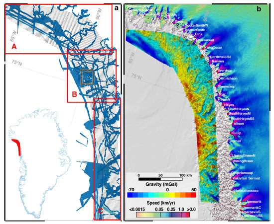 (a) Survey lines (black thin line) of OMG airborne gravity in Northwest (NW) Greenland, with multibeam echo sounding (MBES) data (blue line). Three regions A–C (red box) divide the domain. The orange box delineates a test area with complete MBES and gravity data coverage. Inset shows the location of the surveyed domain in Greenland. (b) Free-air gravity anomalies in mGal (1 mGal = 10 m/s) color coded from blue (−70 mGal) to red (+50 mGal) with 10 mGal contours in black overlaid on a shaded relief of the bed elevation from BMv3. Ice velocity on land ice with glacier names.