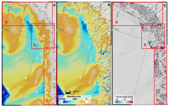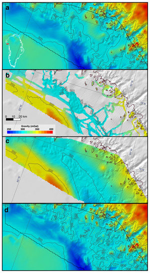 To improve our understanding of ice-ocean interaction in Greenland, NASA launched in 2015 a five-year mission named ‘Ocean Melting Greenland’ (OMG) that includes bathymetry mapping with multibeam echo sounder (MBES) and airborne high-resolution gravity, airborne high-resolution surface topography, and physical properties (temperature, salinity, and conductivity) of the ocean waters from air-dropped probes [14]. As a first result, Morlighem et al. [17] compiled a novel bed topography of the Greenland Ice Sheet, BMv3, that uses a mass conservation method on land, forced by the OMG bathymetric data at the ice margin. Off shore, the mass conservation approach does not apply, hence BMv3 combines IBCAOv3, OMG MBES, and other recent data sets. Shipborne MBES surveys cannot be extended across the entire continental shelf because the area to be surveyed is too large and the mapping task would be too time consuming and expensive. Airborne, high-resolution gravity data offers an alternative to survey large areas at a reduced spatial resolution [18,19]. The challenge of the gravity data inversion is to properly constrain the underlying geology which influences the absolute gravity field [20,21].