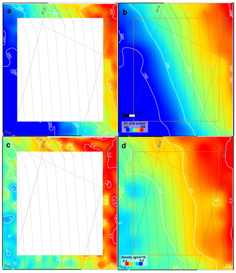 Test area in Figure 1a (a) DC shift along the periphery of test area in B. (b) DC shift interpolated from the periphery using a minimum curvature algorithm, with 10 mGal contours in white. (c) Density values along the periphery of test area in B. (d) Density values interpolated from the periphery using a minimum curvature algorithm, with 0.2 g/cm (1 g/cm = 1000 kg/m) contours in white.