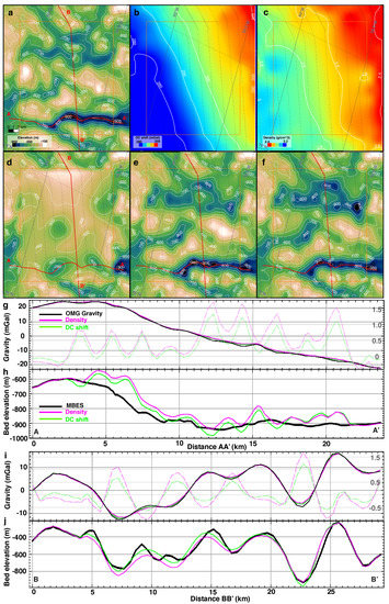 Comparing the bed elevation along A-A and B-B (Figure 4g, Table 1), we find a mean error of the inversion ranging from −20 to +50 m and a standard deviation ranging from 39 to 50 m. Over the entire domain, the mean error is −13 to −41 m with a standard deviation of 62 to 68 m. The best solution is obtained using the DC shift algorithm, especially along the survey line B-B. Along trough A-A, we note undulations of ±60 m with a wavelength of 2 km in both the density and DC shift solutions that reflect the line spacing of the survey and half wavelength of the gravity data. Please note that these undulations are not present along the survey line B-B.