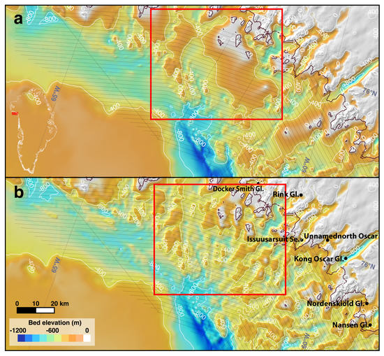 Region A in Figure 1a (a) Original bed elevation combining MBES measurements, IBCAOv3 off shore, BMv3 on shore [17], and a mathematical interpolation in between. (b) Final bed elevation with the addition of the OMG gravity data. Elevation contours (white) every 400 m. Brown line is the ice-ocean boundary. The red box delineates an example area where channel connectivity did not exist in the original bathymetry.