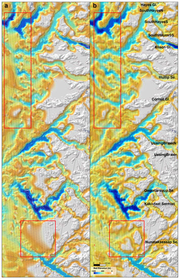 Region B in Figure 1a (a) Original bed elevation with MBES measurements, IBCAOv3 off shore, BMv3 on shore [17], and a mathematical interpolation in between. (b) Final bed elevation with the addition of the OMG gravity data. Elevation contours (white) every 400 m. Brown line is the ice-ocean boundary. Red boxes delineate example areas where channel connectivity did not exist in the original bathymetry.