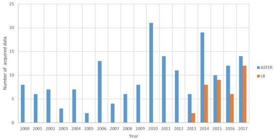 In this study, two satellite datasets were used: L8 with the on-board Thermal Infrared Sensor (TIRS), launched on February 2013 [29], and the ASTER sensor launched in December 1999 on the Terra satellite [65,66]. The TIR data time series were collected excluding cloudy scenes. The time series analyzed are radiance calibrated and geometrically corrected images (level 1T) of ASTER five TIR bands covering the period from 2000 to 2017 and level 1T L8 TIRS data covering the period from 2013 to 2017. In order to have the same spatial resolution for both data sets, the 100 m ground resolution TIR L8 data were re-sampled to correspond to the ASTER TIR spatial resolution of 90 m using the nearest neighbor resampling method.
