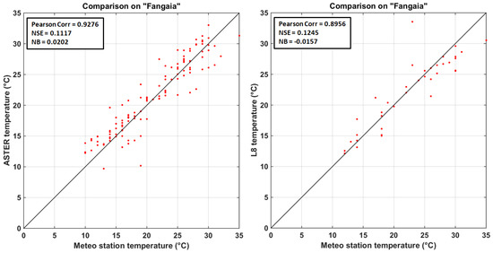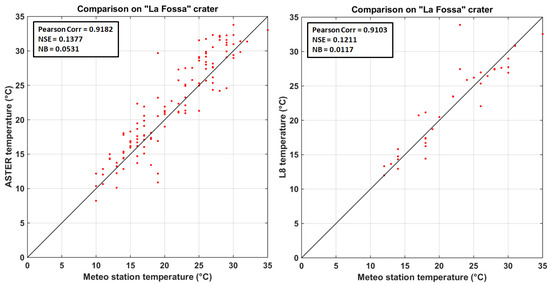 Here we focus on the time series obtained by analysing 170 nighttime images of ASTER data acquired from 2000 to 2017 and 38 nighttime images of L8 data acquired from 2013 to 2017. The meteorological station time series were collected considering the same day and time of satellite acquisition in order to compare the information. Two areas of Vulcano Island were considered: La Fossa crater and the mud pool “Fangaia” areas. These sites have been selected because they have an apparent temperature higher than the surrounding area. In Figure 6 and Figure 7, the scatter plots of the surface temperature retrieved by the satellite and those registered by the meteo station for the two test areas and the three correlation indices are displayed.