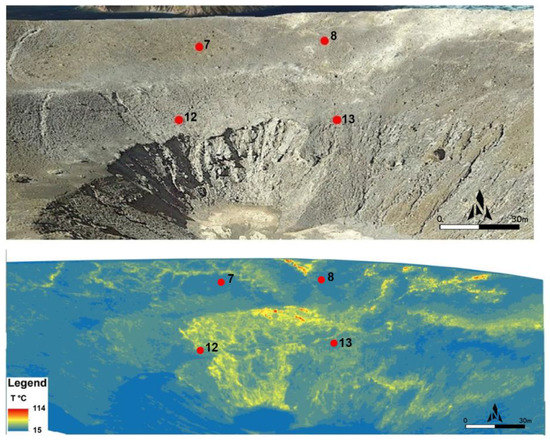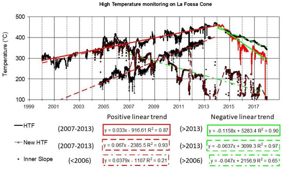 Intense fumarolic degassing persists in La Fossa crater, and significant variations observed in the fumarole vents temperature at La Fossa crater were documented [13,14,15]. In 1926, fumarole temperatures reached more than 600 °C and the highest value, 670 °C, was measured in 1993 [61]. Until March 1995, La Fossa temperatures were higher than 500 ºC, while fumaroles located outside the crater vents ranged between 350 °C and 500 °C. After 1995, the temperature of fumaroles started to decrease while the surface of active vents increased, and many new vents opened at the edge of the active cone [12,62]. In particular, La Fossa crater is characterized by thermal anomalies that, during the seismic activity which occurred from 2004 to 2006 [63,64], were marked by strong increases of the temperature of the fumaroles and an increase of the size of the surface area covered by the fumarolic field.