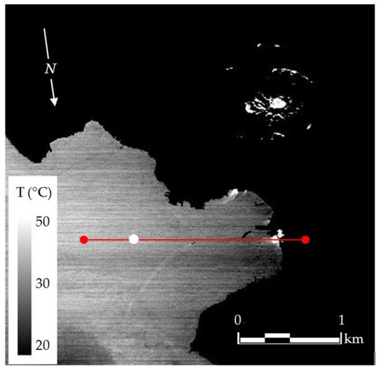 The camera was calibrated before and after the survey held on 16 July 2014, with a variable temperature target. This initial pre-processing of the TIR imagery required the conversion of at-sensor-radiance values to surface temperature using a first-order correction for atmospheric absorption, surface emissivity and ambient temperature effects using ResearchIR Software. This correction includes the distance from the target to the camera, the atmosphere temperature and the humidity content, all measured in situ. An emissivity value of 0.95 was used for the first-order correction that is an appropriate value for this kind of volcanic rock, i.e., basalt with a smooth surface ranged from 0.971 to 0.975 [84].