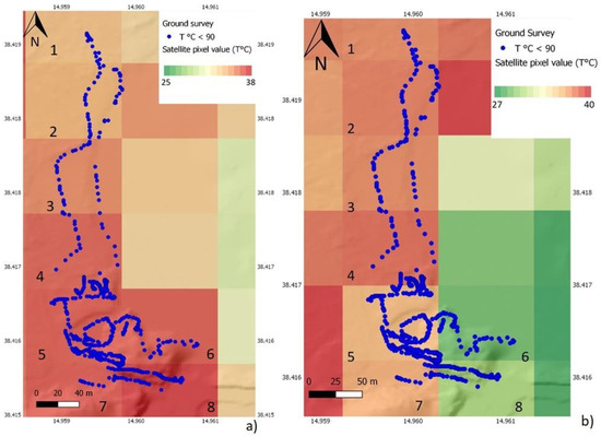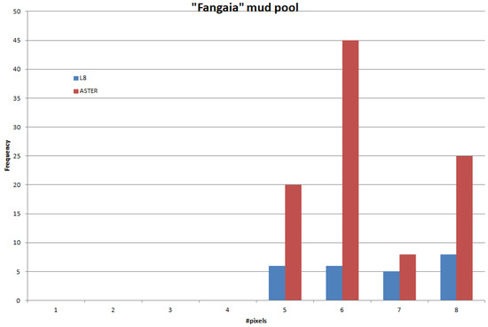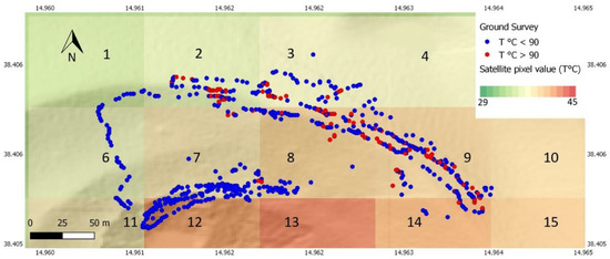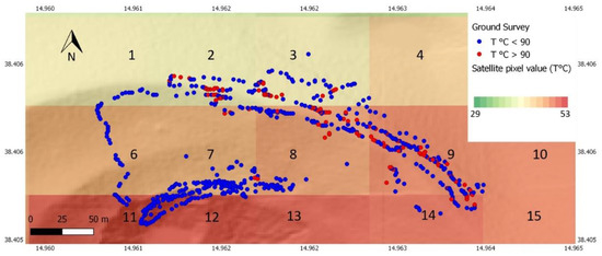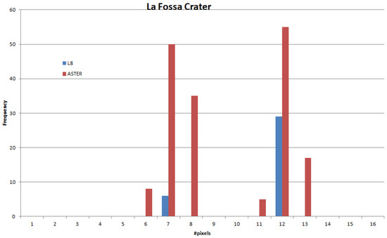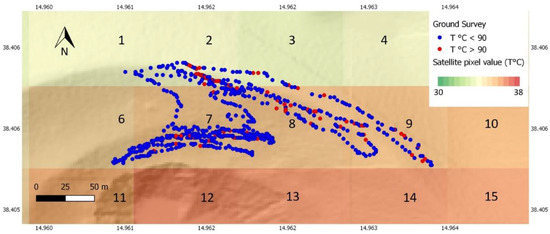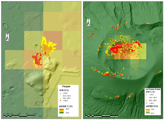 In this work, ASTER and L8 time series are processed in order to identify thermal anomalies on the Island of Vulcano, which could potentially be related to changes in volcanic activity. In the literature, thermal anomalies are extracted from data with a spatial resolution of around 1 km (e.g., ATSR, MODIS, AVHRR) [36,37,38]. In this work, we use data with a spatial resolution of 90–100 m. We consider this resolution comparable with the extension of the crater area and therefore suitable to retrieve sufficient variation of the surface temperature sampled in detail, which seems comparable to the ground measurements performed along the volcanic area.