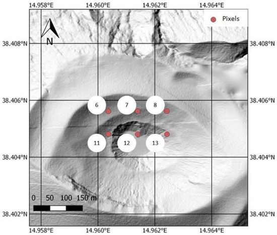 Location on the top of La Fossa Cone of the sensors for the thermal monitoring included in the INGV network (on a Lidar-derived DEM-shaded relief image [47]). The interval of acquisition is one hour.