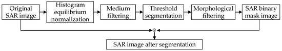 SAR images are normalized after the histogram equalization, and the target regions of interest in SAR images are extracted by selecting uniform thresholds. Suppose that is the SAR image after equilibrium normalization, is any pixel of the image , and is the SAR binary mask image after threshold segmentation. If , then and this pixel is regarded as the background; if , then and this pixel is recognized as the target. is the uniform threshold.
