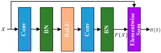 The schematic diagram of a residual block is shown in Figure 3. It contains two convolutional layers and two BN layers and one ReLU activation layer. From Figure 3, the residual network connects the input and the output node through the structure of skip mapping. It transforms the optimization function into the residual function: