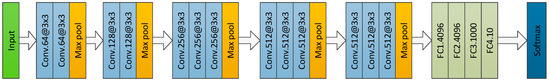 The image classification method based on deep learning can automatically learn the spatial information and texture characteristics of images to avoid the intricacies of manual feature extraction and feature selection, reduce the influence of subjective factors on the classification results, and improve the universality of the classification algorithm. The most common method is CNN. Generally speaking, the accuracy of target classification can be improved by deepening the network properly. As is known, less layers means faster training. However, the CNN with less layers cannot be compared with DCNN in terms of the recognition accuracy. VGGNet is a typical DCNN developed by the University of Oxford visual geometry group and researchers at Google DeepMind. VGGNet explored the relationship between the deepness and the performance of the CNN. Through stacking the small convolutional kernels of 3 × 3 and maximum pooling layers of 2 × 2 repeatedly, VGGNet successfully constructs the CNN with 16 and 19 layers, which are called VGG16 and VGG19, respectively. VGGNet won the second class prize in classification project and the first class prize in the positioning project of the ILSVTC 2014 competition [37]. VGGNet is one classic DCNN structure with good generalization. Its structure diagram is shown in Figure 4, which is mainly composed of 13 convolutional layers, 5 pooling layers, and 4 full connection layers [38]. We have added one full connection layer based on the VGG16. The following parts give the detailed description of VGGNet.