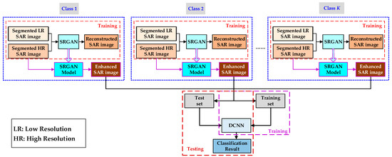 Figure 5 is the flow chart of ATR for SAR image based on SRGAN and DCNN. First, in order to obtain the corresponding low-resolution SAR image, the segmented SAR image is four-fold down-sampled. The segmented SAR image, as the high-resolution image, and the low-resolution SAR image are input into SRGAN for training. After the countermeasure between the generator and the discriminator of SRGAN, the Nash equilibrium is finally achieved and the well-trained SRGAN model is obtained. Second, the segmented SAR image as the low-resolution SAR image is input into the trained SRGAN model again to improve its visual resolution to achieve image enhancement and obtain the final enhanced SAR image. Third, the enhanced SAR image after the pre-processing of subtracting mean value is divided into a training set and a test set, where the training set is sent to the DCNN to train its network parameters and learn the intrinsic features of the SAR image until convergence. Finally, the test set is sent to the trained DCNN, and the classification results are output to achieve a good classification of the SAR targets.