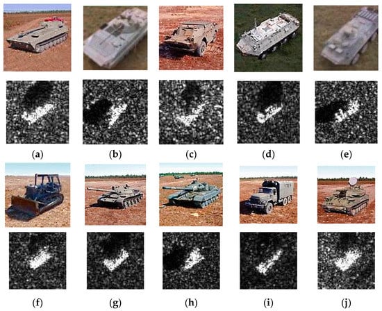 This paper utilizes the open data set, MSTAR, for the verification of the effectiveness of the proposed algorithm. The MSTAR data set was gathered in 1995 and 1996 separately by Sandia X-band (9.6 GHz) HH-polarization spotlight SAR and contains ten categories of ground military vehicles. The pitching angles were 15°, 17°, 30°, and 45°. The azimuth angles ranged from 0° to 360°. The original SAR image resolution was 0.3 m × 0.3 m and the image size was 128 × 128. These ten categories of ground military targets include BTR-70, BTR-60, BMP-2, T-72, T-62, 2S1, BRDM-2, D-7, ZIL-131, and ZSU-234. Figure 6 shows the optical images and the corresponding SAR images of the ten categories of targets. It can be seen that the resolution of SAR images is low, the targets’ edge information is not clear, and it is not easy to extract the detailed information of the images.