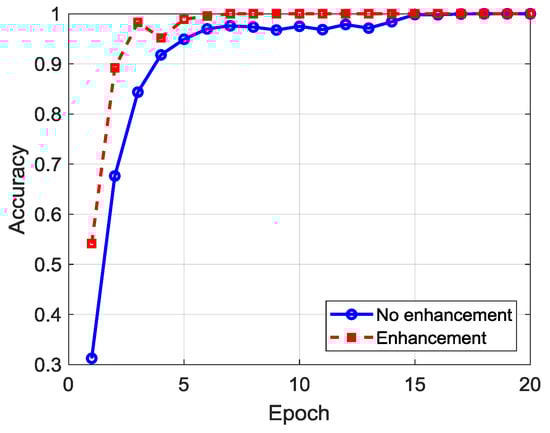 Figure 12 gives the comparison of convergence of DCNN with and without image enhancement. The solid line is the convergence curve of training accuracy with training epoch without image enhancement, and the dashed line denotes the convergence curve of training accuracy with training epoch with image enhancement. From Figure 12, the training accuracy reached a stable 100% after 15 epochs without SAR image enhancement. The convergence speed became very fast after image enhancement based on SRGAN. The training accuracy reached 100% at the fifth epoch for the first time, and it was stable after the ninth epoch. This fully proves that the features of the SAR image after enhancement were easier to extract and learn than the one without enhancement.