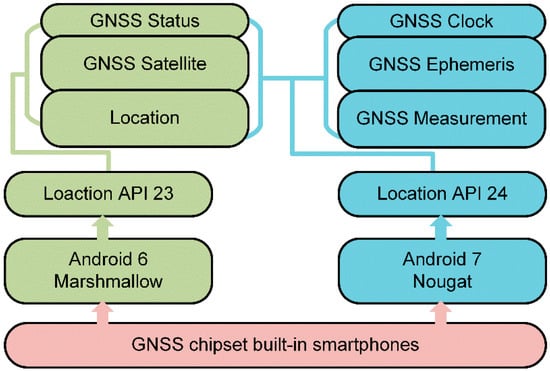 With the release of GNSS observations from the Android Nougat system, smartphones, such as Huawei P10 and Samsung S8 models, can provide pseudorange, Doppler, and carrier phase observations of GNSS systems [10]. Moreover, a new generation of mass-market chips based on dual frequency measurements is next to be commercialized [11]. These released data enable us to develop advanced algorithms to increase positioning accuracy. Using a single-frequency PPP model and an extern SBAS correction, sub-meter accuracy can be reached with android GNSS observations [12]. The decimeter positioning accuracy can also be obtained through rapid-static surveys of a real-time kinematic (RTK) model without ambiguity resolution [13,14]. Zhang et al. [15] proposed a filtering algorithm with velocity estimation of the time-differenced carrier phase (TDCP), and reached decimeter-level accuracy after convergence with static data. Some android applications utilize GNSS raw measurements already. PPP Wizlite allows precise positioning on a Nexus 5X device, and requires internet connection to obtain corrections [13]. RTMC Converter can convert android raw measurements to the RTCM format. Geo++ Rinex Logger can record android raw measurements in the Rinex file format [16]. However, this topic remains a research hotspot as researchers aim to achieve satisfactory accuracy and high availability of positioning through android smartphones, especially with GNSS observations and built-in micro-electromechanical systems (MEMS) sensors under complex pedestrian scenarios.