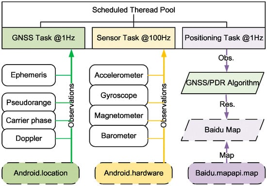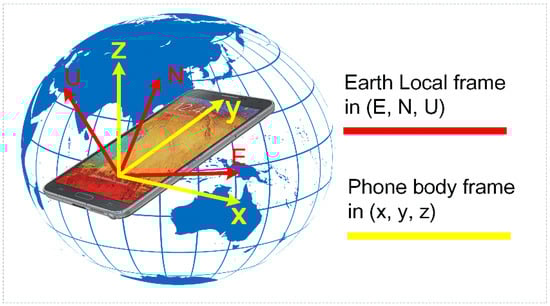 In recent years, mass-market sensors have become ubiquitous in mobile intelligent terminals. GNSS chipsets, inertial measurement units (IMUs), magnetometers, and barometers are getting smaller and cheaper. The evolvement of smartphone built-in sensors facilitates the determination of a user’s positioning, space-based navigation, and time (PNT) information, which are widely recognized as important elements for global information infrastructure and are considered the basics of location-based services (LBS). Under ideal scenarios, consumer-grade GNSS receivers can reach several meters of positioning accuracy, the improvement of which will further promote the diversification of LBS [1]. However, the positioning capability will decrease in some harsh conditions, such as urban canyons or short distance tunnels, where GNSS signals suffer from a low signal-to-noise ratio and severe multipath [2,3]. Multi-GNSS receiver autonomous integrity monitoring (RAIM) can reduce the large positioning errors and achieve satisfactory positioning performance in degraded-signal scenarios [4,5]. Furthermore, pedestrian navigation systems (PNSs) are expected to provide continuous positioning and enhanced navigation performance under such cases. Based on fusing measurements of IMUs and magnetometers, the characteristics of human gait can be exploited in pedestrian dead reckoning (PDR) algorithms, which are the primary component of PNSs to continuous relative position [6,7]. A PDR system performs three main tasks: step detection, step length estimation, and heading determination [8,9]. However, the performance of a PDR system would significantly decrease with the increase in recursion time, due to sensor noise and model errors. Therefore, the absolute positioning accuracy of GNSS and the relative positioning accuracy of PDR complement each other in a smartphone, enabling the smartphone to provide continuous positioning services.