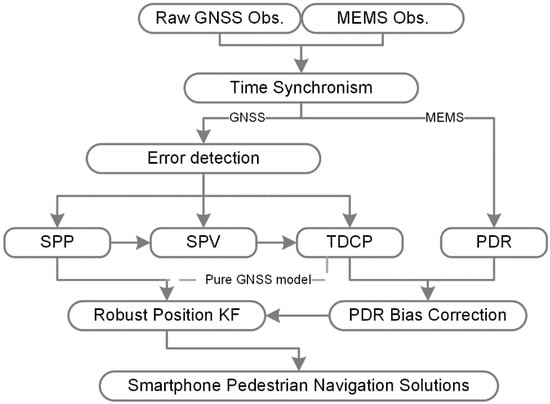 Firstly, the observations of GNSS and the MEMS are obtained and synchronized from the android API. Then, for the GNSS process module, the gross errors are detected according to the SNR and pseudorange rate, and the position and velocity are estimated by single-point positioning (SPP) and a single-point velocity (SPV) determination algorithm. Furthermore, the precise velocity estimation is realized by the time-differenced carrier phase (TDCP) technique. Meanwhile, the three-dimensional (3-D) relative position changes are computed through the PDR system with the IMU, magnetometer, and barometer observations. Thereafter, the bias of step length and heading of the modeled PDR system is corrected through a sliding window. Finally, a robust Kalman filter is applied to fuse the position change and GNSS positioning. If the pure GNSS processing model is chosen, the position change is fed by the TDCP instead of 3-D PDR. Some key techniques to implement the fusion of GNSS and PDR are discussed in this section.