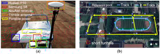 In this section, the Walker application is tested in the field in terms of characteristics of observation, accuracy of static GNSS positioning, and kinematic navigation performance. The GNSS observations are assessed in terms of C/N0, station single-difference pseudorange residuals, pseudorange rate, phase rate, and Doppler. The stochastic errors of the MEMS sensors are analyzed using the Allan variance method. The static GNSS data were collected under a normal open sky with devices, as shown in Figure 5, including Samsung S8 and Huawei P10 smartphones as well as a geodetic-quality antenna (Trimble Zephyr-2) and a receiver (NovAtel ProPak6). The kinematic track shown in Figure 5 is in a playground surrounding the field under open sky, except for several parts shielded by nearby trees and buildings. There are some reference points along the track whose coordinates are determined by professional RTK equipment previously. The accuracy of RTK fixed solution is centimeter level, which ensures the accuracy of reference point. Two reference points in short tunnels are measured by total station. In addition, the accuracy comparison of all results is in WGS84 coordinate system.