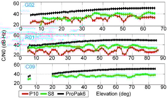 Average C/N0 values vs. elevation for GPS, GLONASS, and BDS observations from S8, P10, and geodetic devices. The C/N0 values within an elevation range of 1° are classified into one group, and compute a group average.