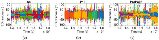 Station single-difference pseudorange residuals of all observed satellites in static data collected by smartphone S8 (a), smartphone P10 (b), and geodetic devices ProPak6 (c), respectively. Different colors correspond to different satellites.