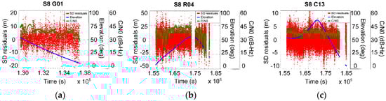 The regularity of station single-difference residuals, elevation, and C/N0 change with time. (a) The number 1 satellite of GPS (G01); (b) the number 4 satellite of GLONASS (R04); (c) the number 13 satellite of BDS (C13).